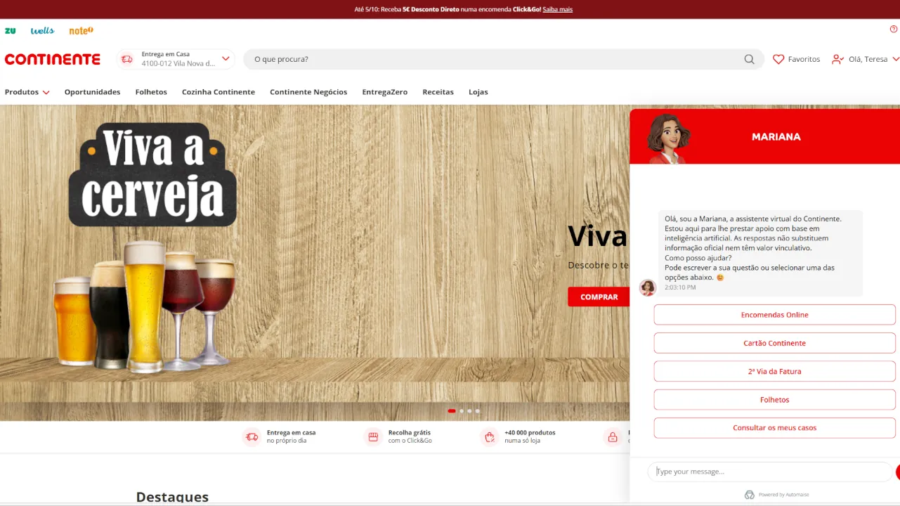O Continente e a tecnológica Automaise anunciaram o lançamento do primeiro assistente virtual de inteligência artificial desenvolvido especificamente para o setor dos hipermercados em Portugal. A solução, designada por Mariana, já se encontra disponível no Continente Online e na aplicação Cartão Continente, assegurando apoio imediato e personalizado aos clientes em qualquer altura do dia.