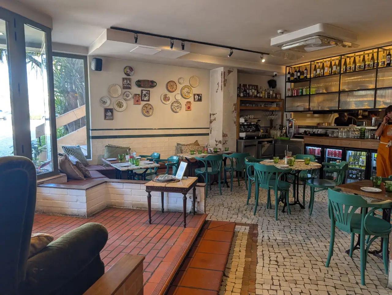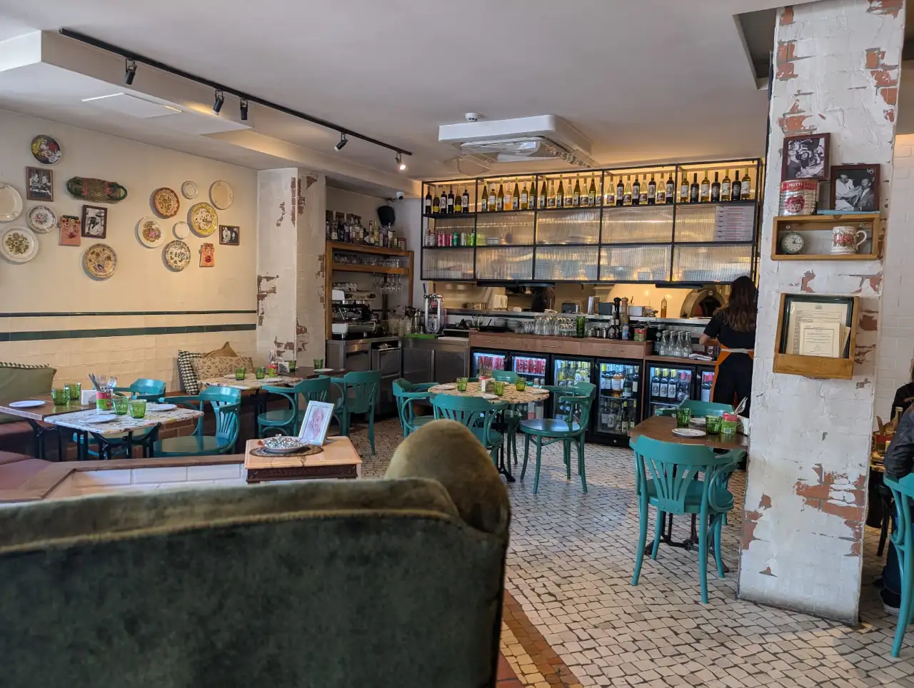 O mobiliário alterna entre mesas de madeira maciça e o padrão terrazzo, com cadeiras estofadas num verde profundo – tudo convidando a refeições demoradas. Não obstante, o coração do restaurante é, sem dúvida, a cozinha aberta, onde o trabalho coreografado dos chefs e pizzaiolos acontece à volta de um grande forno redondo e de uma bancada de mármore com pizzas quentes e massas sempre a sair.