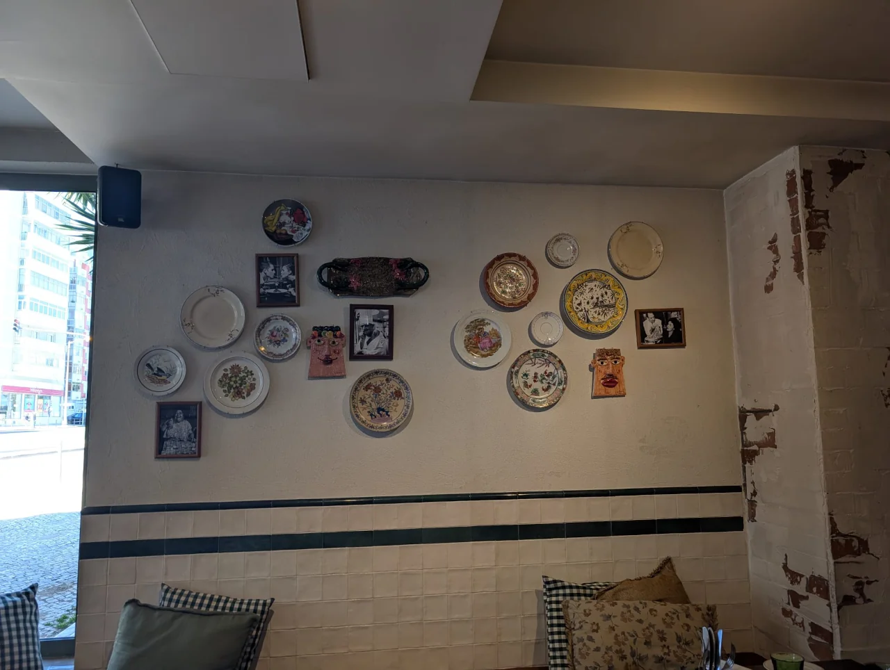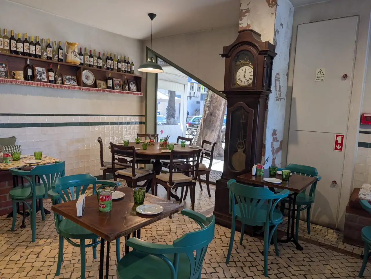 As condutas de ventilação à vista e o uso extensivo de madeira clara em estantes repletas de garrafas, cerâmicas, livros e fotografias antigas conferem ao espaço uma patine de história. Um dos elementos que achamos mais carismáticos é a “parede de memórias”, um mosaico visual com imagens de várias personalidades que marcaram o percurso da casa, incluindo uma fotografia da cantora Ágata que se topa logo à entrada.