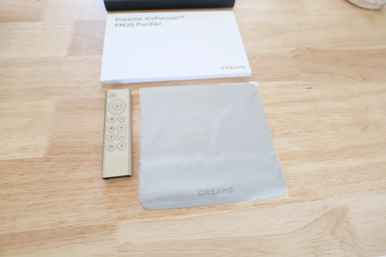 Na embalagem do Dreame PM20, para além do aparelho em si, encontramos também alguns acessórios incluídos, nomeadamente o comando remoto, o manual de instruções e um pequeno pano de limpeza. Tudo isto vem organizado com cuidado dentro de uma caixa preta, com o logótipo da Dreame em letras douradas.