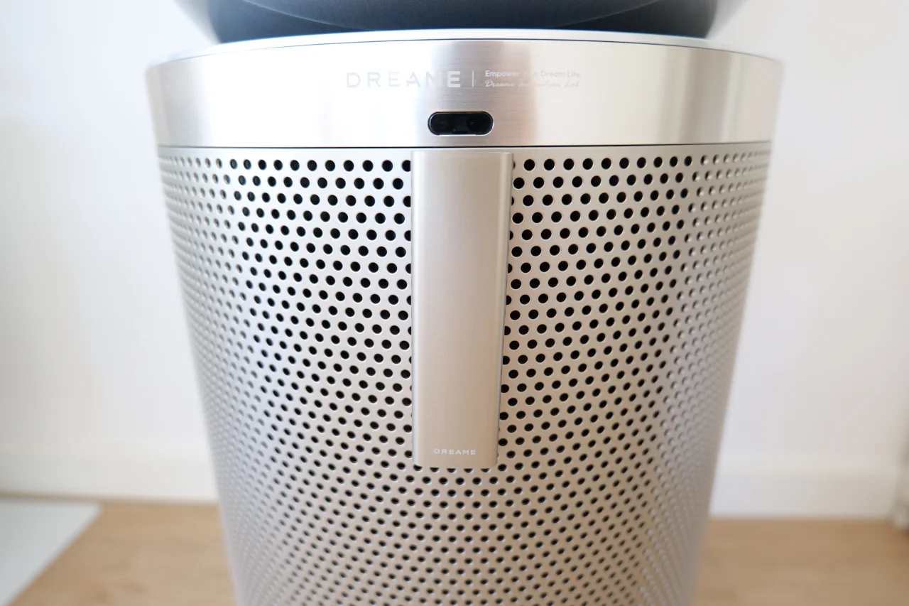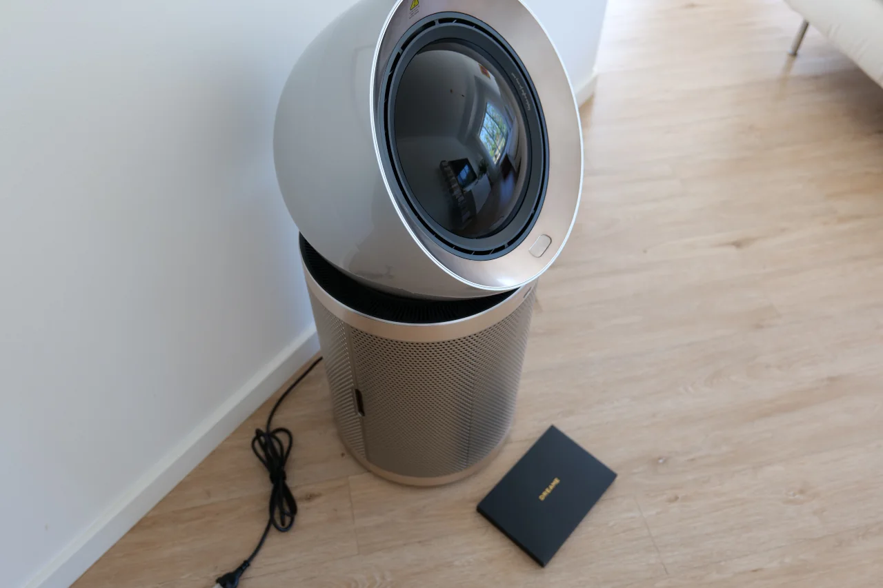 Logo à partida, é impossível ignorar a presença física do Dreame PM20, já que não é o tipo de equipamento que se possa esconder discretamente no canto da sala. Conta com uma estrutura cilíndrica em metal dourado, perfurada por pequenos orifícios, e uma cabeça arredondada em plástico prateado que integra a saída de ar e um pequeno ecrã frontal. A estética é moderna, com um toque futurista, e a primeira vez que o vi fez-me lembrar um pequeno robô doméstico (com a parte traseira da cabeça arredondada e a frente ligeiramente achatada que acabam por lhe dar um ar fofo). É, sem dúvida, um objeto que desperta curiosidade e acaba sempre por ser comentado por quem entra cá em casa.