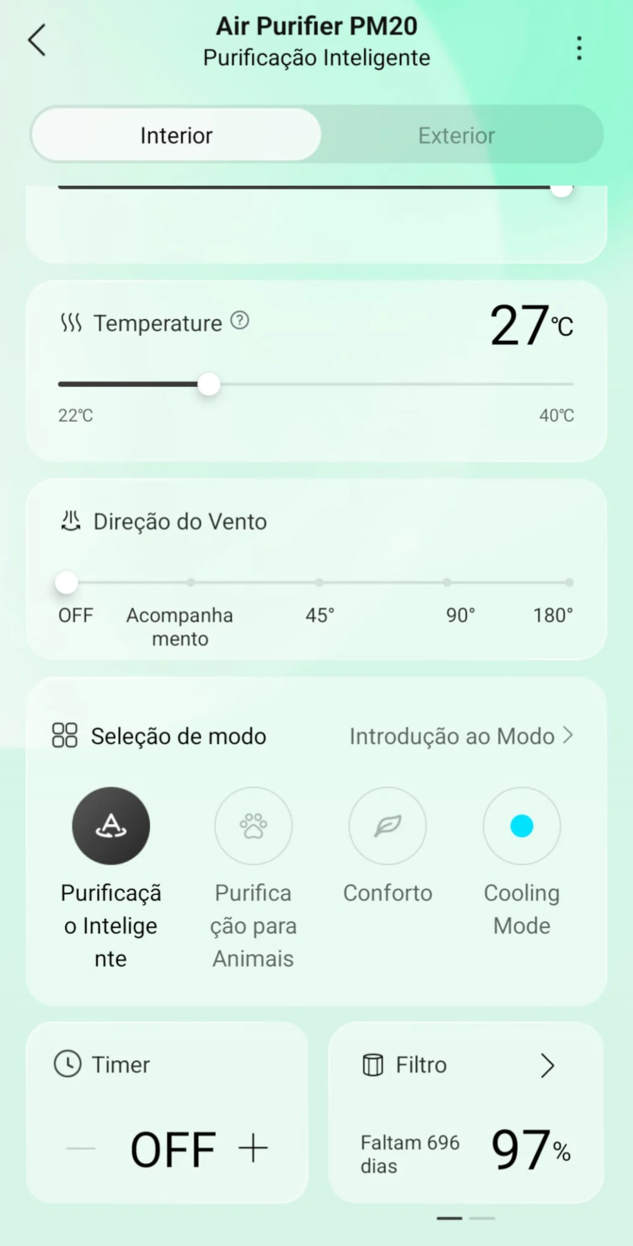 Relativamente à sua aplicação móvel, a Dreame Home, esta é uma parte central da experiência. Permite ligar e desligar o aparelho remotamente, ajustar modos, velocidades, direção do fluxo de ar, ativar aquecimento ou arrefecimento, consultar qualidade do ar em tempo real e definir horários. É através desta aplicação que podemos selecionar os diferentes modos. O modo de purificação inteligente (que é o que utilizo diariamente, praticamente como definição padrão), o modo dedicado a animais (costumo ativá-lo pelo menos uma vez por dia, normalmente de manhã, poucos minutos depois de acordar e noto logo o ambiente mais leve). Há ainda o modo conforto e o cooling mode, que fica reservado para dias mais quentes, quando preciso de circulação extra de ar sem abdicar da purificação. Com a aplicação sinto que estou a ter um controlo mais completo e uma leitura mais clara do que se está a passar com a qualidade do ar. Existe ainda a possibilidade de controlo por voz, um complemento interessante e que acrescenta alguma conveniência, sobretudo para ajustes rápidos, mas na prática acabo quase sempre por recorrer ao comando físico do Dreame PM20.
