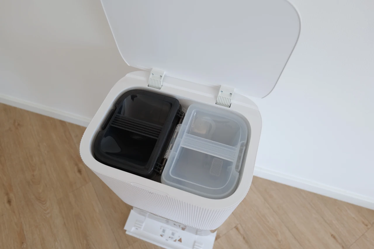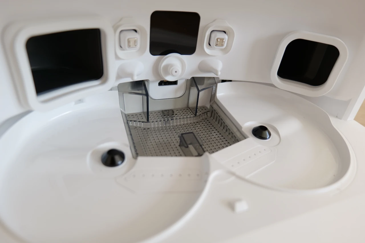 Na parte superior da estação encontra-se uma tampa que se levanta facilmente, revelando os depósitos de água limpa e suja, bem organizados e de fácil acesso, com cerca de 4,5l e 4l, respetivamente. Como ambos têm uma capacidade generosa, acabam por tornar-se um pouco pesados quando cheios, mas que se traduz também numa clara vantagem: reduz a necessidade de manutenção frequente. Em vez de estar constantemente a encher ou esvaziar os tanques, é possível deixá-los durante alguns ciclos de limpeza antes de precisar de os encher novamente.