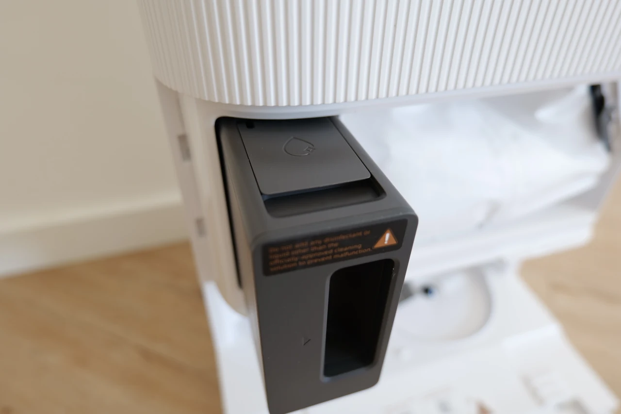 Já na parte inferior da estação, começam a revelar-se alguns dos pormenores que realmente distinguem este modelo dos restantes. É aqui que se encontra o sistema responsável pela lavagem das mopas, o AceClean DryBoard. Para fazer a limpeza, é lançada água a 80 °C (uma temperatura suficientemente elevada para eliminar bactérias e odores) seguidos por um processo de secagem automática que impede a formação de humidade e aquele cheiro desagradável que tantas vezes se instala noutros modelos. Este sistema permite poupar tempo e trabalho, já que elimina a necessidade de estar constantemente a remover as mopas para as lavar manualmente ou na máquina, se bem que de vez em quando é recomendado fazê-lo, sobretudo após limpezas mais intensas.