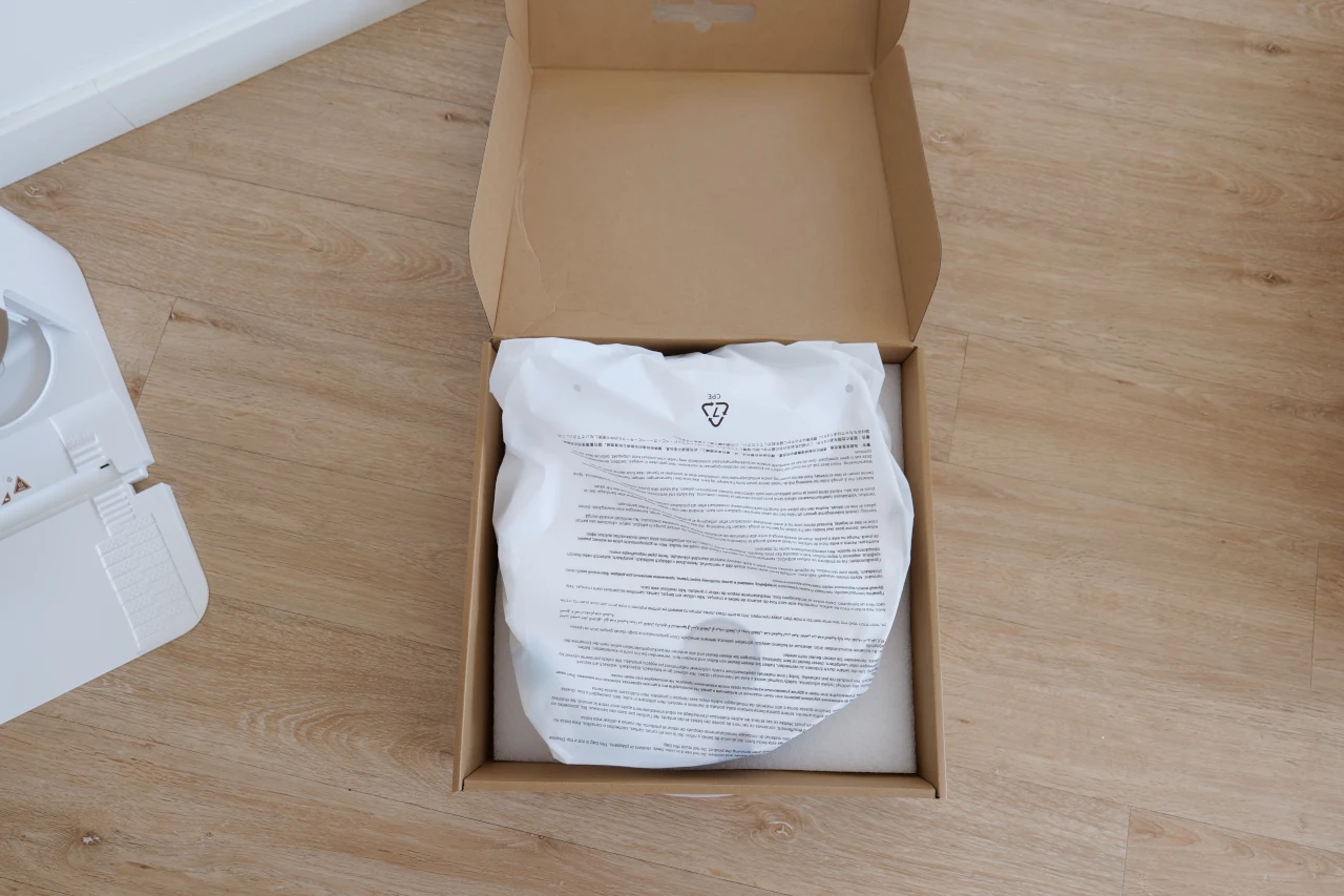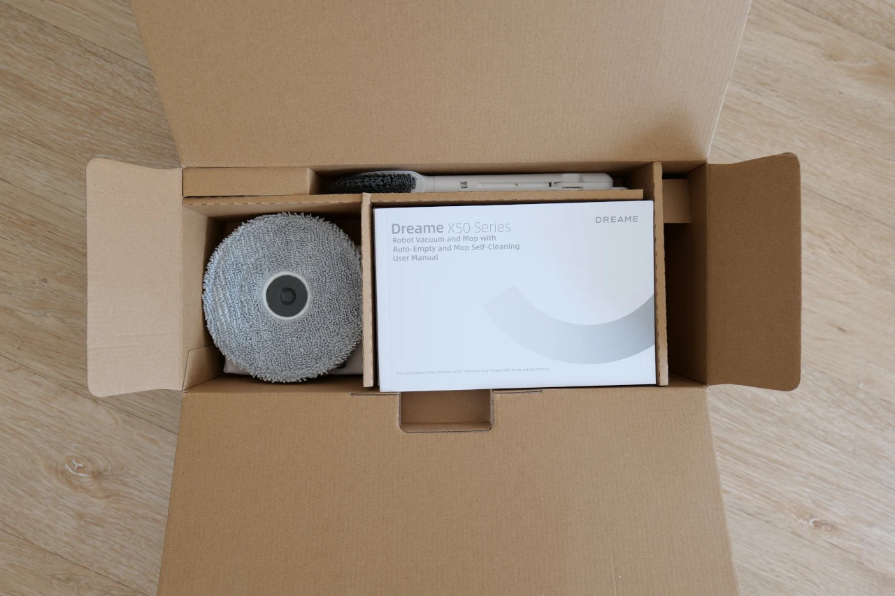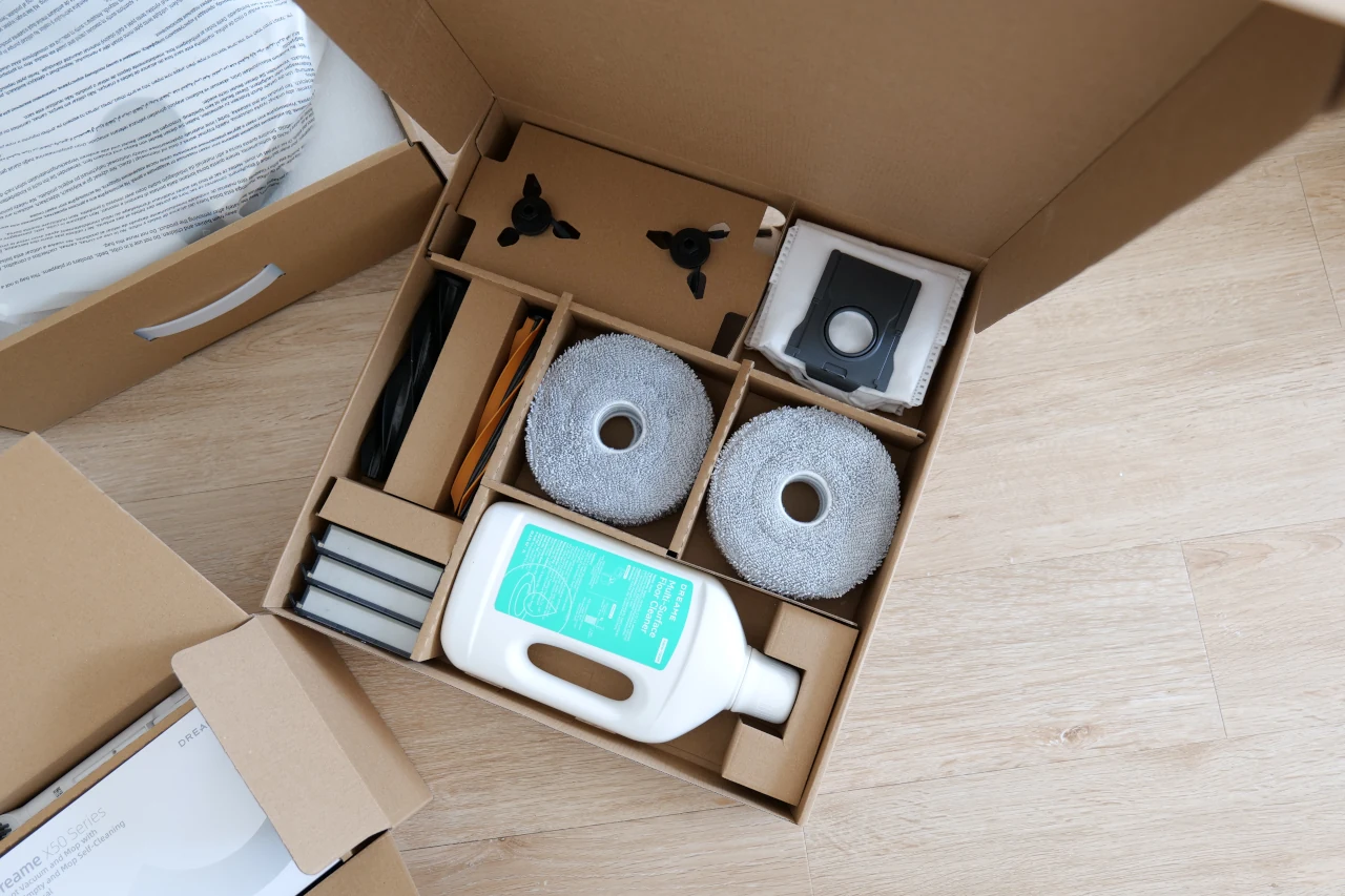 Ao receber a caixa, temos vários acessórios que acompanham o Dreame X50 Ultra, como por exemplo a sua estação de carregamento, a escova de limpeza principal, dois suportes magnéticos das mopas e as duas respetivas mopas. Já vêm pré-instalados outros acessórios, como a escova principal, a escova de limpeza lateral, sistema anti-calcário e depósito do pó. E, no caso da versão que recebemos, a Complete, o nome não podia ser mais apropriado. É, sem dúvida, o conjunto de acessórios mais completo e generoso que já vi num robô aspirador. A versão Complete vem acompanhada por uma caixa extra repleta de acessórios, e não, não é força de expressão. Lá dentro encontramos duas escovas laterais, sacos do pó, duas escovas principais, três filtros, uma garrafa de detergente multi-superfícies e várias mopas de substituição. Um verdadeiro kit de manutenção pensado ao detalhe e pronto para durar vários anos, demonstrando assim uma atenção especial da parte da Dreame para com os seus clientes, algo que nem sempre se vê neste segmento.