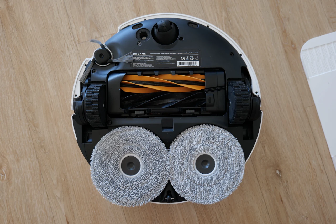 Finalmente temos os dois encaixes magnéticos onde se fixam as mopas de limpeza. Uma delas possui um pequeno mecanismo de extensão que lhe permite sair ligeiramente da estrutura do robô, alcançando zonas mais difíceis, como cantos ou rodapés, tal como acontece com a escova lateral flexível. Além disso, graças ao sensor de deteção de carpetes, que identifica automaticamente quando o robot passa sobre um tapete ou alcatifa, o sistema eleva as mopas de limpeza para evitar que entrem em contacto com o tecido, impedindo que fiquem húmidas ou deixem marcas indesejadas.