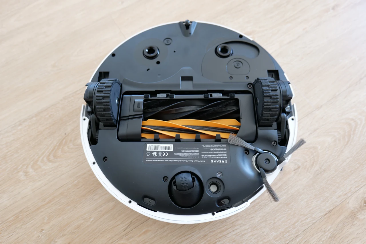Já na parte inferior do Dreame X50 Ultra encontramos duas grandes rodas motrizes que deslizam com suavidade sobre o chão, sendo surpreendentemente silenciosas durante o movimento.