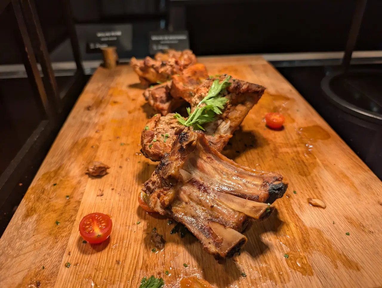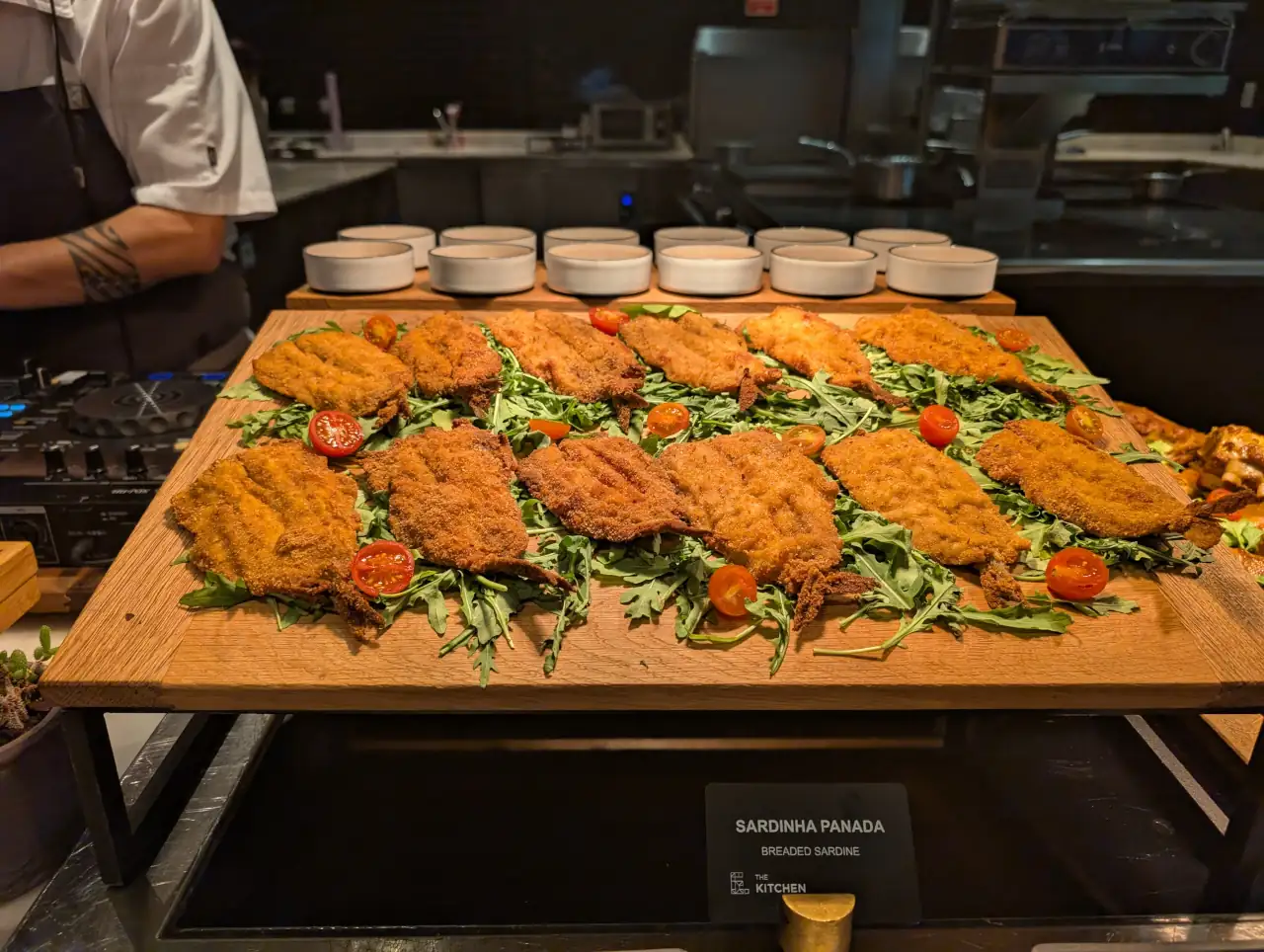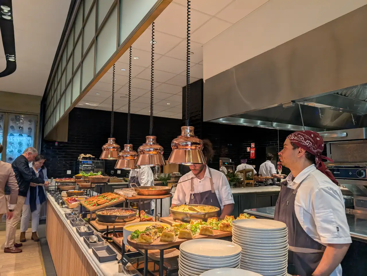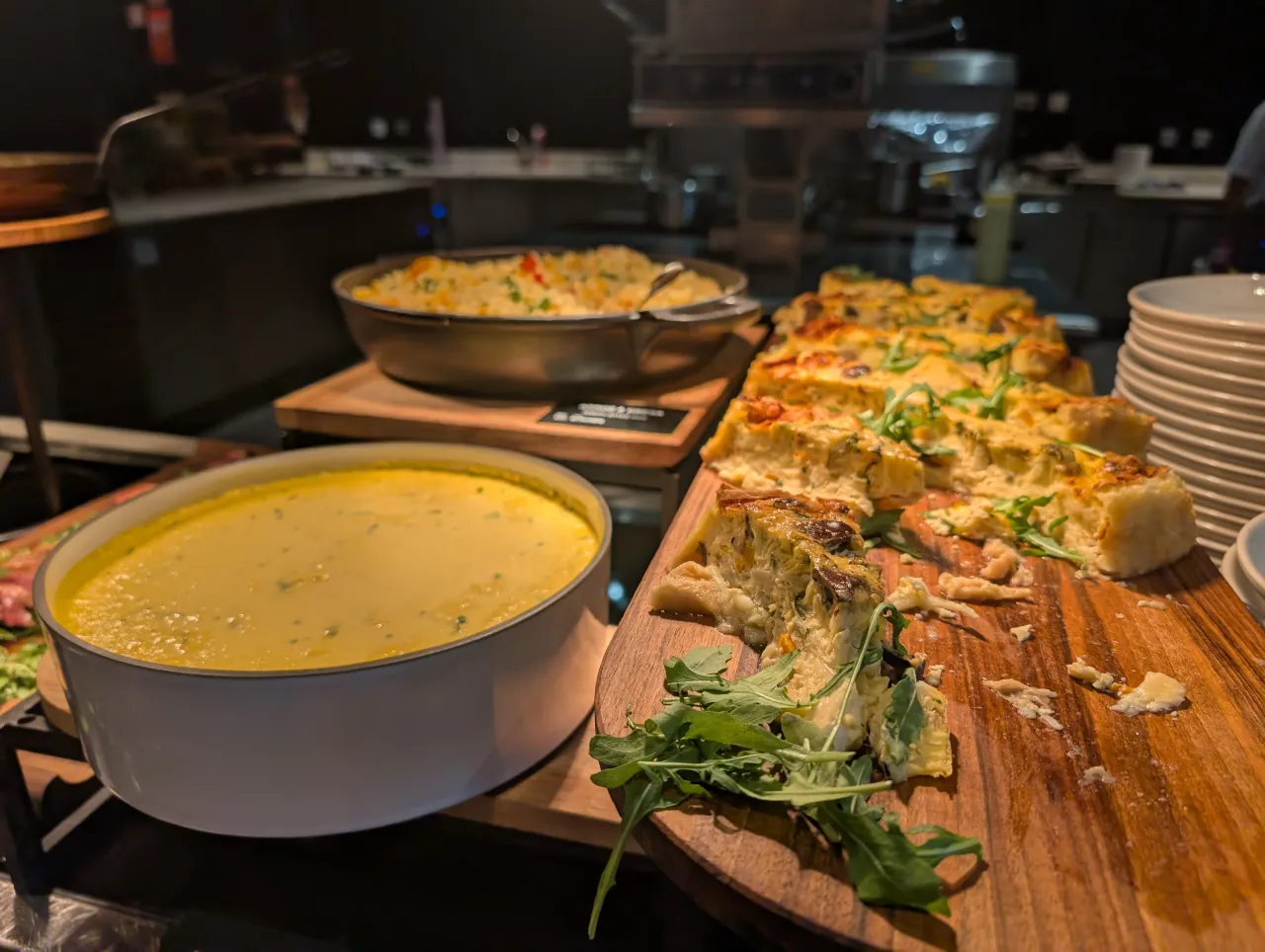 Outro aspeto interessante é a ideia das estações interativas. Para além das carnes cozinhadas no forno, trinchadas no momento, e dos grelhados, existem várias estações por onde os clientes se podem ir abastecendo livremente de comida, tanto quanto desejarem.