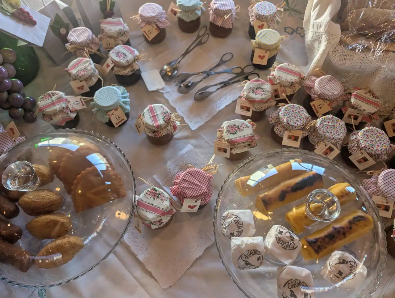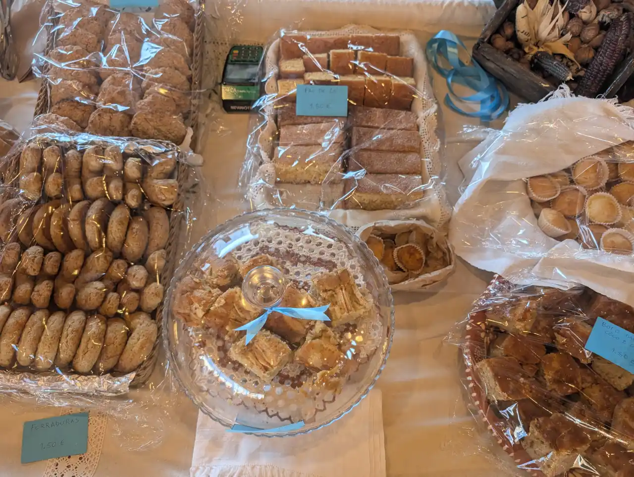 Antero Jesus, um dos participantes da prova de vinhos e presidente da Associação, foi quem nos descreveu a doçaria feita pelos elementos do grupo: broas de anis, bolinhos de coco, ferraduras, arrepiados. “São receitas antigas, feitas em forno a lenha, como antigamente”, explicava. Ofereceu-nos gentilmente o CD do rancho, “para ouvirem as nossas músicas e levarem um bocadinho da festa para casa”. Ficámos a conhecer, também, a Caspiada, Bolo Tradicional apresentado pelo Rancho Folclórico de Pontével; os frutos secos (destacamos as excelentes tâmaras) da Amora Silvestre; vimos, ainda, a Casa Pratas, especializada em queijaria; apreciámos a bonita montra de bolinhos caseiros de Márcia Crena, e os bolos, mel e outros produtos da região, da Associação Cultural do Rancho Folclórico do Vale da Pinta.