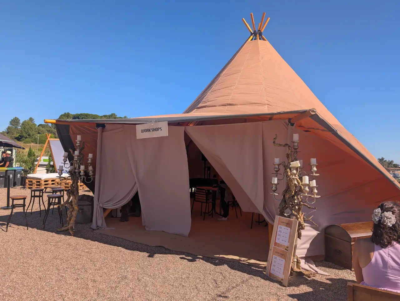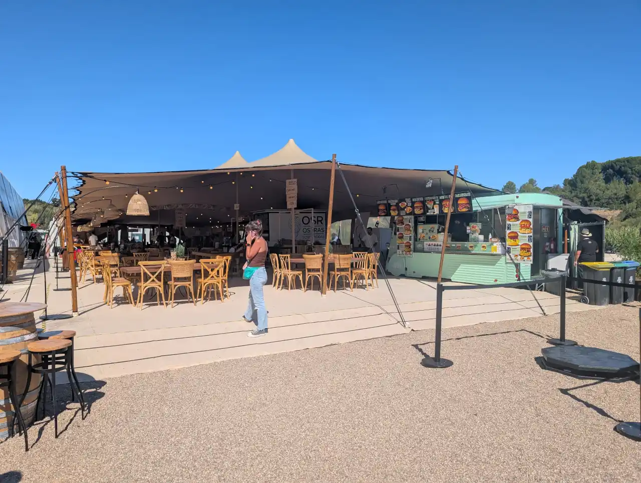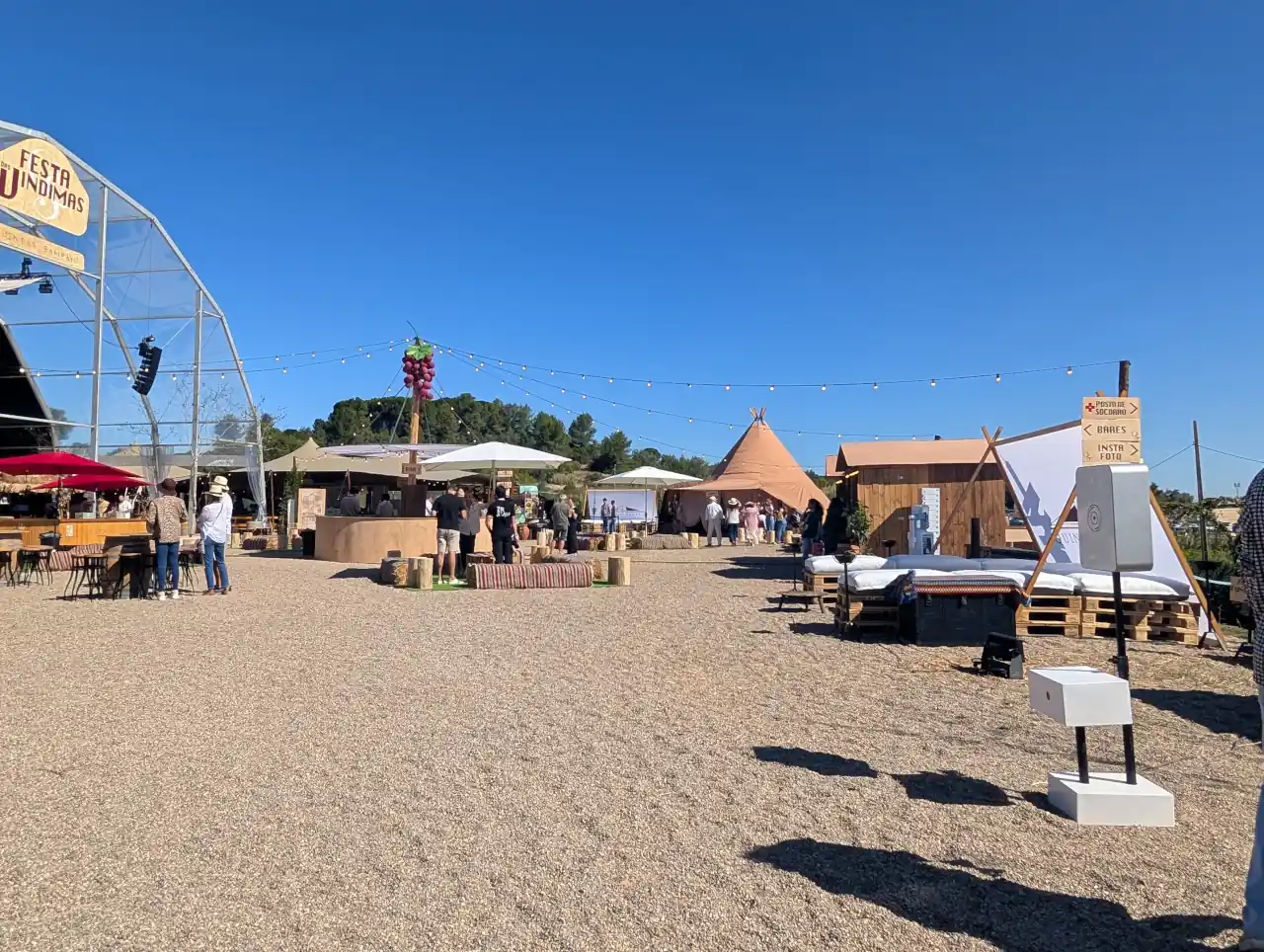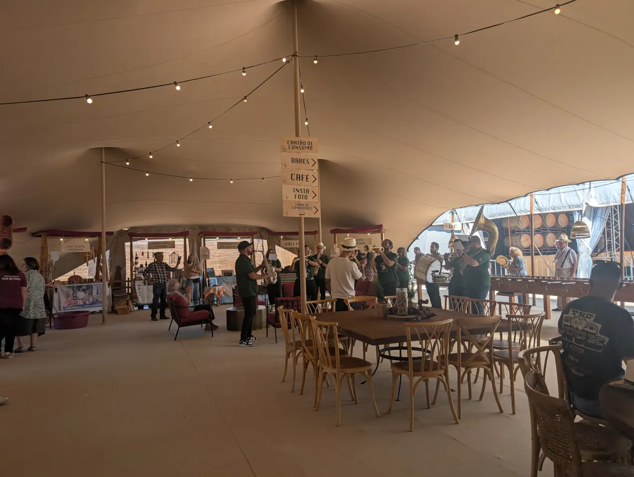 Era difícil não reparar na diversidade de sotaques e idades. Famílias inteiras chegavam com carrinhos de bebé, grupos de amigos vinham de Santarém e Lisboa, curiosos de todo o país apareciam atraídos pelo cartaz musical. E, entre todos, a presença constante dos vinhos da casa, servidos em balcões redondos, as garrafas mantidas frescas em geleiras. “Temos branco e tinto da colheita de 2023 e 2024”, explicava uma das funcionárias do bar. “Servimos ao copo ou à garrafa, como preferirem.”