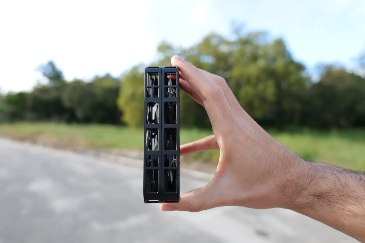 Com apenas 172 x 91 x 43 mm quando dobrado e um peso de 125g, o X1 destaca-se pela portabilidade. Cabe facilmente numa mochila, numa bolsa ou, até, no bolso de um casaco. A construção é feita maioritariamente em plástico, o que levanta preocupações sobre resistência a impactos. Embora o mecanismo de dobragem das hélices seja funcional e as proteções integradas aumentem a segurança – sobretudo para quem nunca utilizou um drone -, o material transmite fragilidade. A sensação geral é de um produto pensado para ser leve, mas não necessariamente robusto. Salientar aqui também que as hélices, contrariamente a outros modelos, estão colocadas não em cima, a “descoberto”, mas sim por baixo, protegidas por uma espécie de grelha, o que fará com que nunca toquem nas vossas mãos, até porque, para o drone pousar, convém que o faça na palma da vossa mão – sim, o HoverAir X1 tem sensores para isso mesmo.