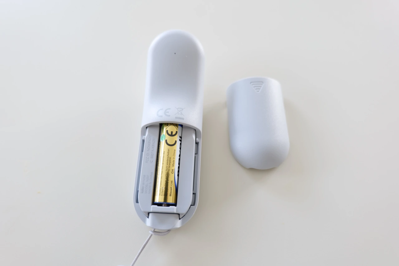 O comando em si é também muito minimalista, com a parte da frente num plástico branco liso e dois botões (o de cima ligeiramente maior que o de baixo, pormenor que ajuda bastante a distinguir entre os dois botões sem ser preciso olhar para eles) no mesmo material plástico liso, mas em cinza claro. Por baixo, em letras da mesma cor, temos a dizer Rakuten Kobo, e na parte de baixo uma pequena ranhura que permite encaixar uma fita de pulso. Na parte superior, temos o botão de emparelhamento Bluetooth, e a parte de trás é toda em cinza claro novamente, com uma tampa removível (em que é preciso uma força quase hercúlea para o fazer) onde está o compartimento da pilha AAA (pilha essa que já vem incluída) e um indicador de luz LED.
