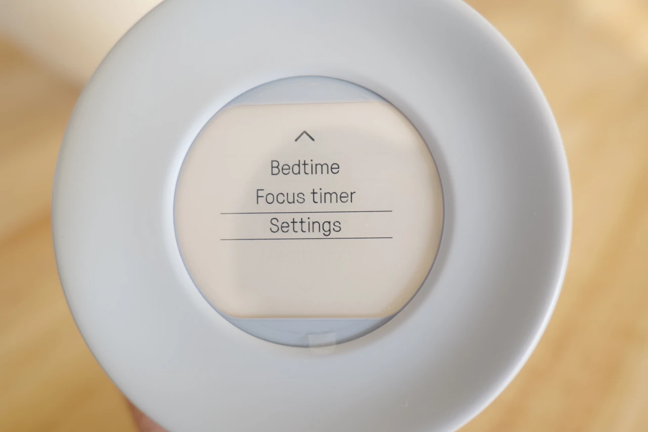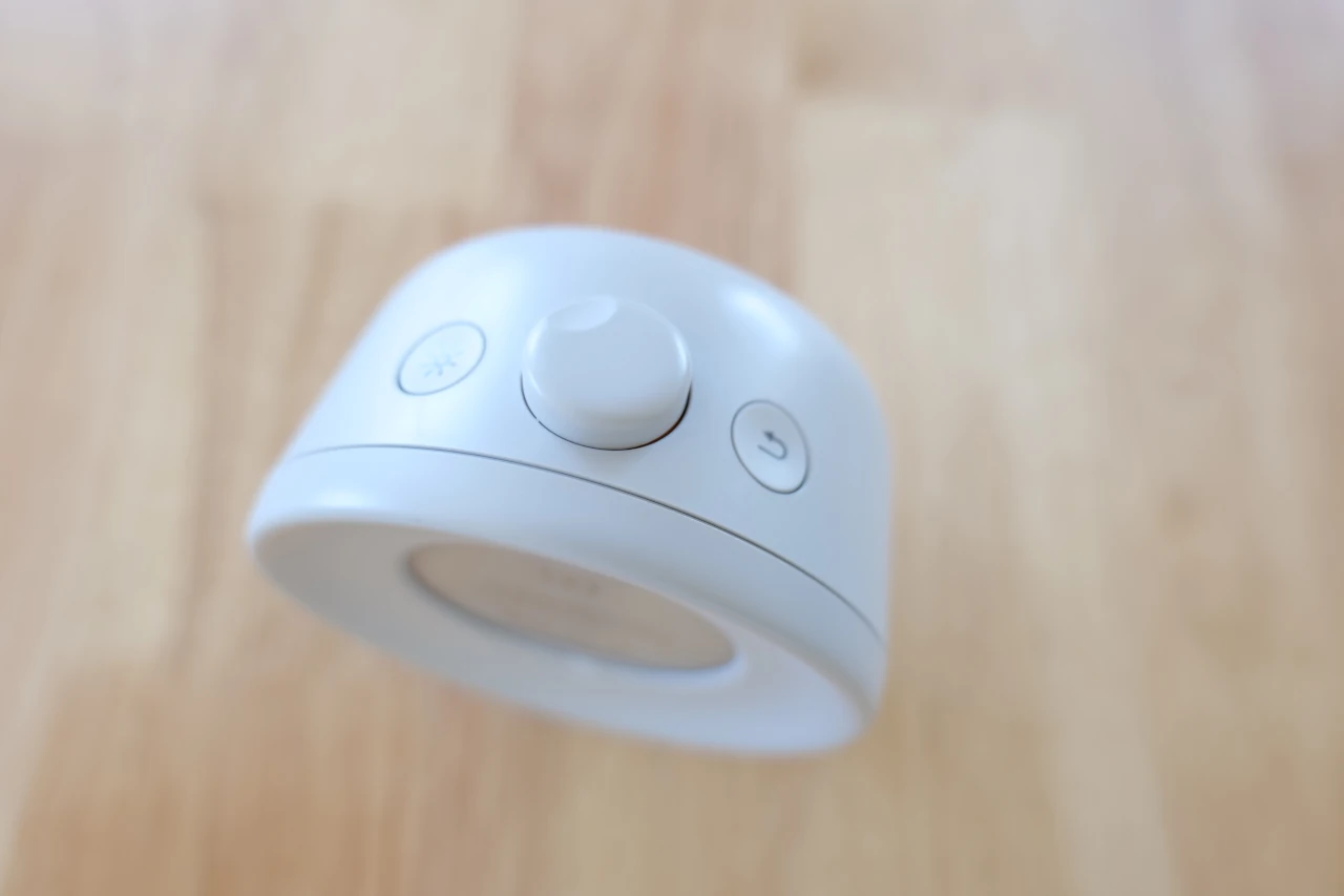 Entretanto na parte superior do Mudita Harmony 2 encontramos o seu sistema de controlo, composto por três botões bem integrados no design minimalista do despertador. O destaque vai para o botão central, de maior dimensão, que tem uma dupla função: pode ser pressionado, mas também rodado, permitindo navegar facilmente pelos menus e opções. De cada lado desse botão principal estão outros dois botões mais pequenos, que servem de apoio para aceder rapidamente a diferentes funções. Um deles, que tem um símbolo do sol, serve para ligar (On) e para acender a luz suave do ecrã (com 2700K), permitindo ver as horas durante a noite sem necessidade de iluminação intensa que possa perturbar o descanso. Esta luz é uma luz quente e discreta, pensada para não cansar os olhos, nem interferir com a sensação de tranquilidade no quarto.