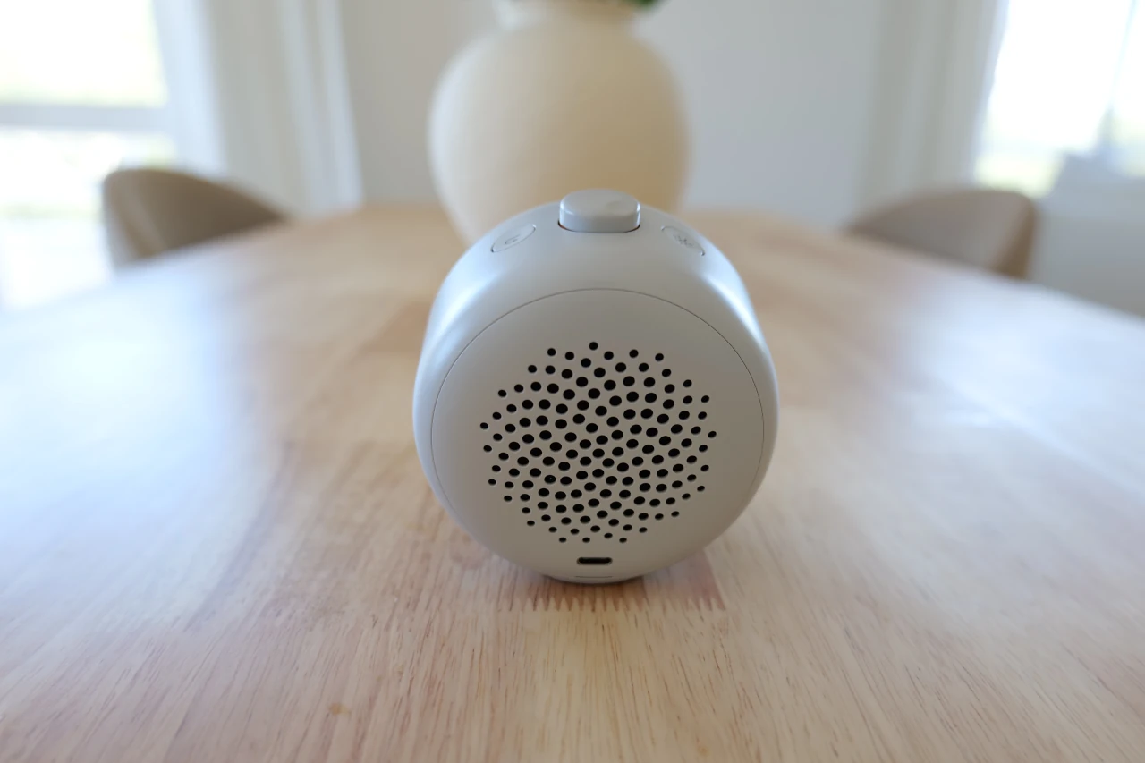 Aliás, fiquei genuinamente surpreendida quanto à qualidade do som: o som é cristalino, com uma nitidez impressionante e uma intensidade equilibrada para uma coluna de dimensões tão reduzidas. Seja para os sons de alarme, para o white noise ou para os sons da natureza, a experiência auditiva é envolvente e agradável, sem distorções ou tonalidades artificiais.