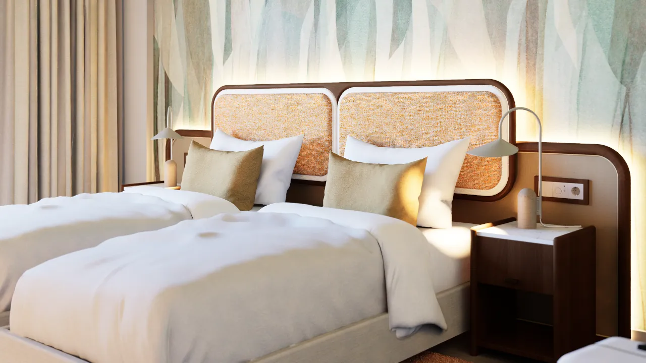 A intervenção contempla a renovação total dos quartos, que passam a integrar nova sinalética e ilustrações temáticas associadas à natureza, como folhas, árvores e aves, através de uma combinação cuidada de texturas e cores. Paralelamente, estão a ser requalificadas as principais áreas comuns do hotel, incluindo lobby, receção, corredores, elevadores, restaurante, bar, esplanada e piscina exterior. O projeto prevê ainda a ampliação do restaurante e a reorganização da zona lounge, permitindo uma maior abertura visual sobre o bar e a área da piscina.