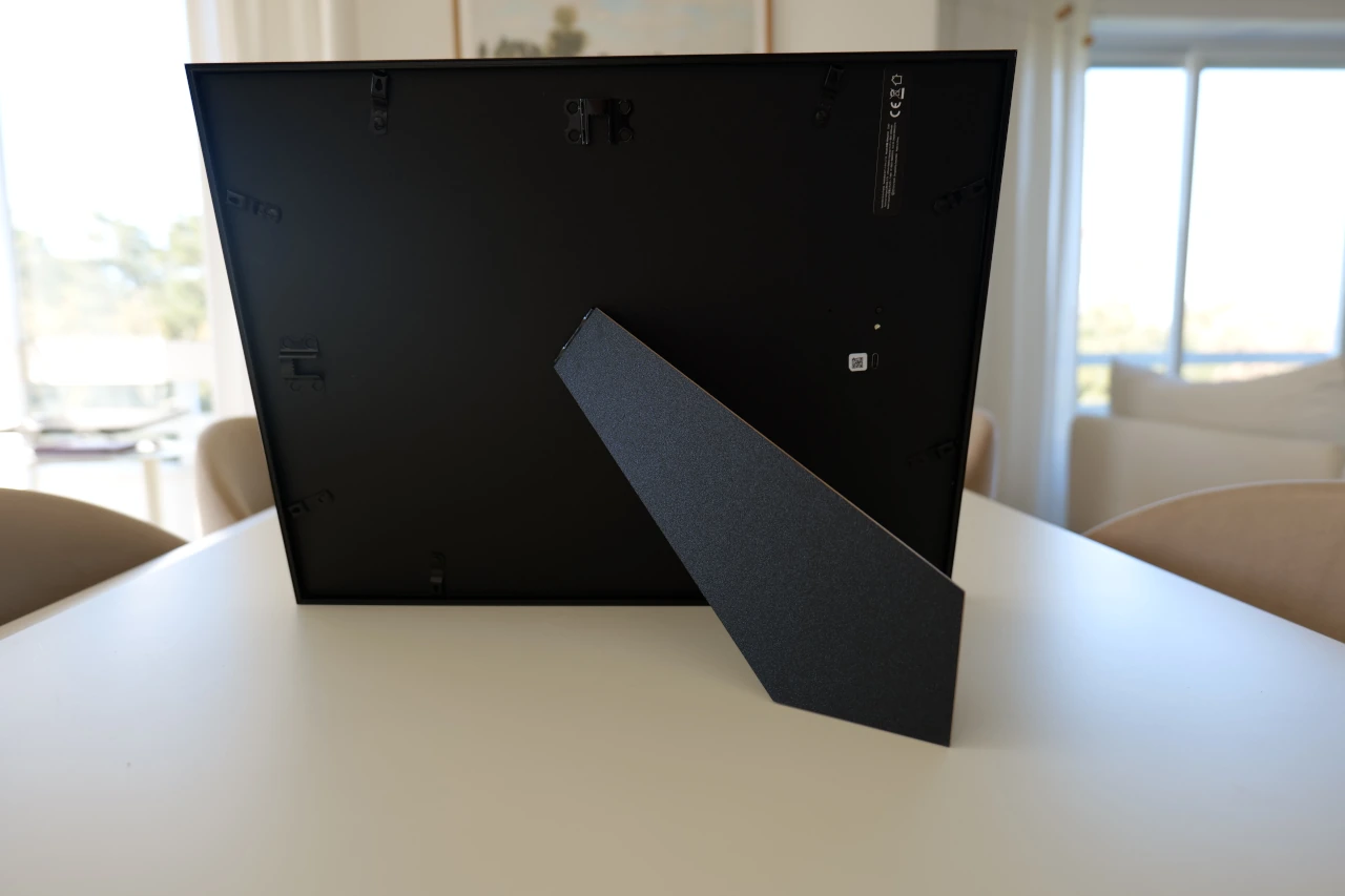 O nível de bolha garante um alinhamento perfeito, os ganchos com pregos integrados simplificam a instalação, enquanto as almofadas adesivas oferecem uma alternativa para quem prefere não furar a parede. Após pendurar a moldura de forma surpreendentemente rápida e intuitiva, fiquei satisfeita por constatar que, até hoje, se mantém firme no mesmo lugar, algo facilitado também pelo facto deste modelo de 13,3 polegadas pesar apenas 1.5kg. Na parte traseira existe um suporte dobrável que permite colocar a moldura numa secretária ou prateleira, tanto em modo paisagem como em modo retrato, tal como de resto também acontece com as molduras tradicionais.