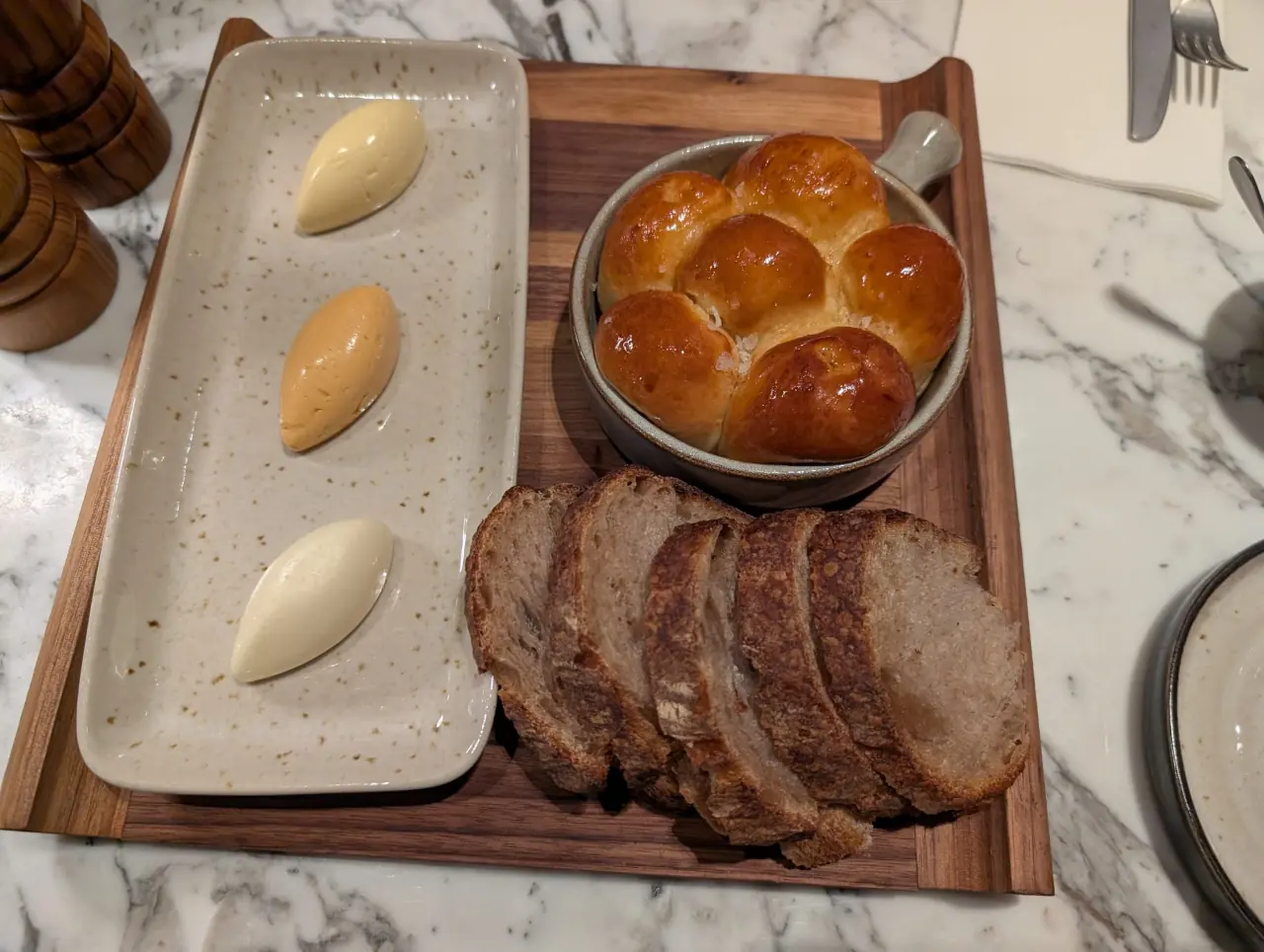 O menu do The Kitchen, esse, é apresentado num tablet e reflete uma viagem por etapas. A primeira parte é o Enquanto Escolhe. Neste separador desenhado para acalmar a fome inicial enquanto se decide o percurso, apresenta-se o Nosso Couvert, composto por Pão de massa mãe e Dinner rolls (um pão floreado, estilo brioche, feito em bolbos fofos e brilhantes), acompanhados por uma Tapenade de azeitona e uma trilogia de manteigas: a pureza dos Açores, uma versão fumada com tomate seco e a irresistível manteiga de alho assado.