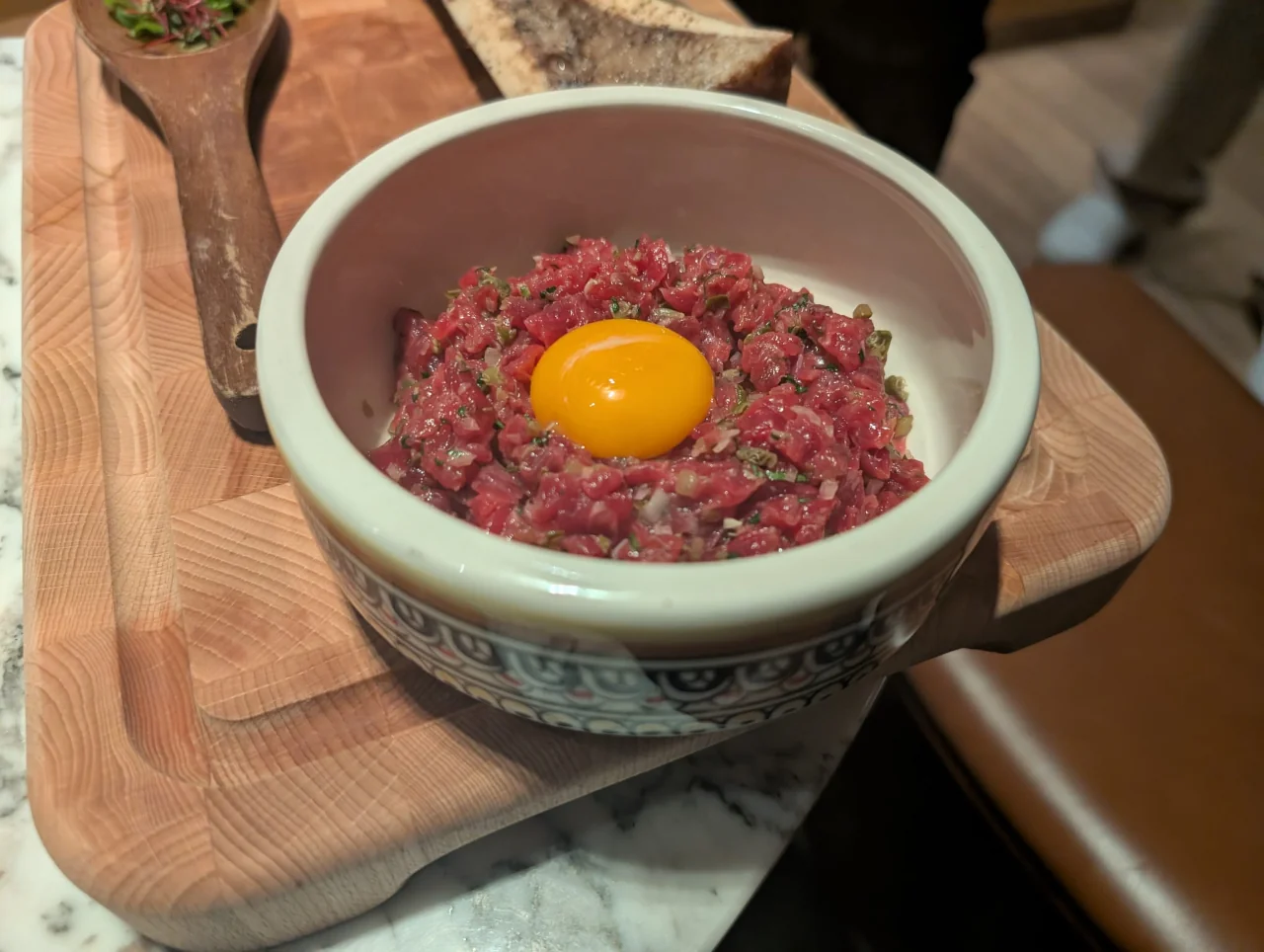 Destaque absoluto, que também provámos, vai para o Tutano e Tártaro do Lombo Fumado. O prato chega à mesa protegido por uma cúpula de porcelana da China que, ao ser levantada, liberta o perfume das farripas de cerejeira. O tutano, assado no forno, serve de base para o tártaro de novilho picado à faca, numa simbiose de temperaturas e texturas fascinante. Confesso que não aprecio particularmente esta modalidade de ter osso no prato, mas o objetivo era raspar o tártaro – como sabemos – carne moída crua temperada – no tutano do osso que cozinhou no forno até atingir o ponto necessário. Daí, a carne vem com os sabores únicos do tutano – uma delícia!