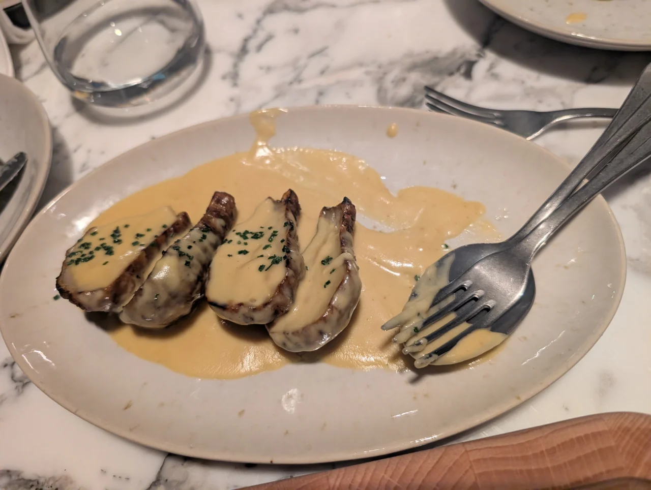 Todos os cortes são acompanhados por um molho à escolha. Por obséquio, foram-nos trazidos vários, entre os quais, o clássico Beurre Café de Paris, Béarnaise, Chimichurri e a Manteiga de Alho. Todos nos despertam sensações de retorno a espaços profundos e bem guardados da nossa memória – são verdadeira arte de Chef.