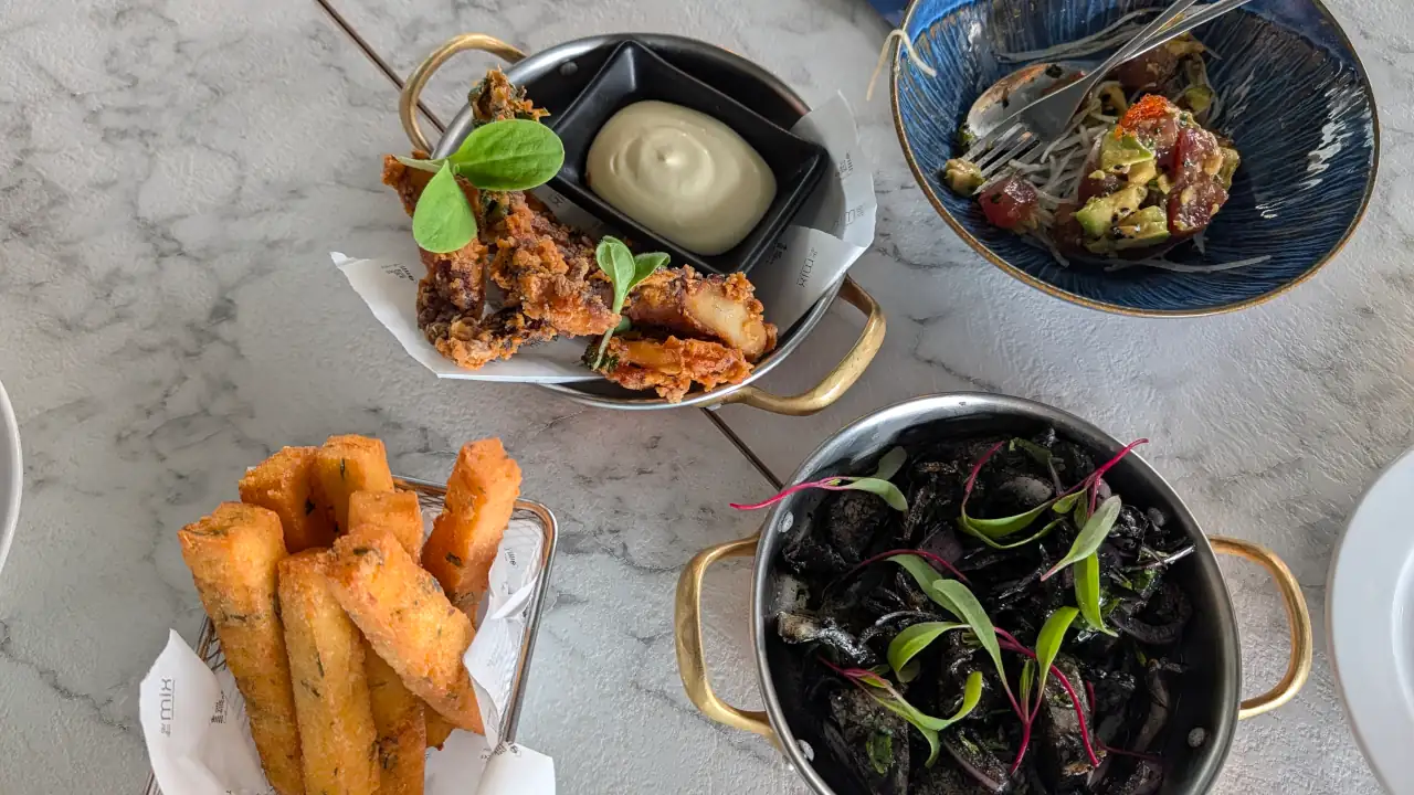 A continuar os momentos de partilha, mas já com entradas quentes de cozinha internacional, fez-se um passeio pelos ingredientes da época, uma vez que o The Mix vai alterando a sua carta consoante as estações do ano. Um exemplo disso mesmo são os Croquetes de presunto pata negra com maionese chipotle, daquelas entradas que primeiro se estranham… e depois entranham. Já não tão fora da caixa, mas igualmente deliciosos, tivemos também direito aos Choquinhos grelhados com vinagreta de tinta e milho frito, bem como Lascas de polvo e maionese de alho assado – eu, pessoalmente, que não sou fã de polvo, dei por mim a comer várias lascas…